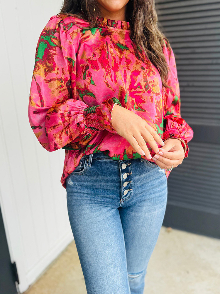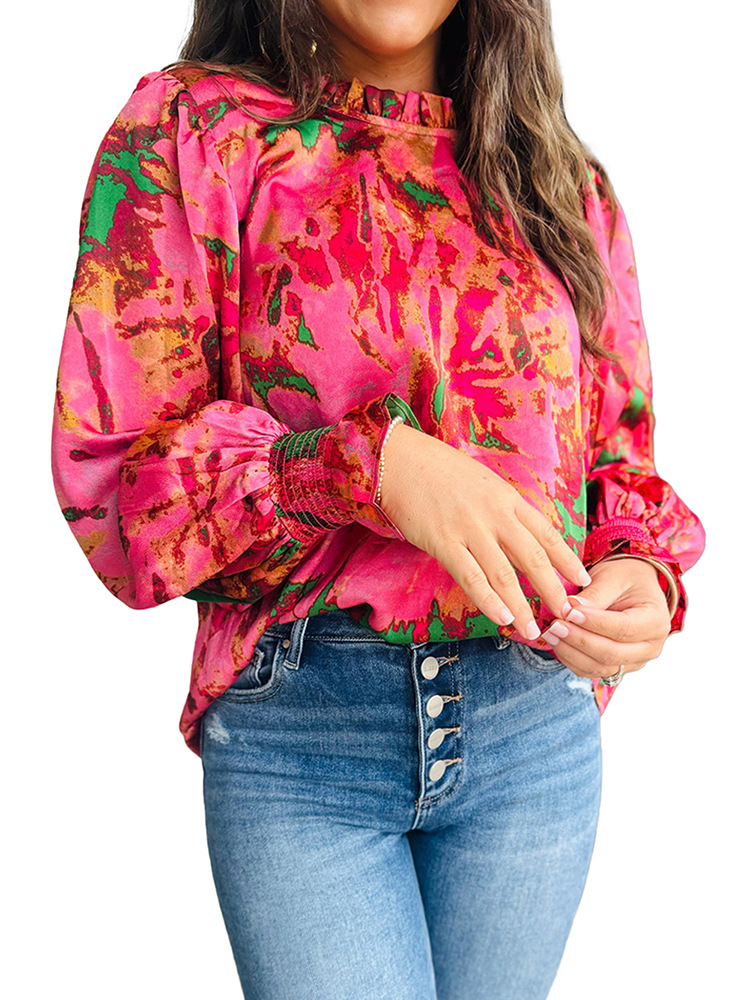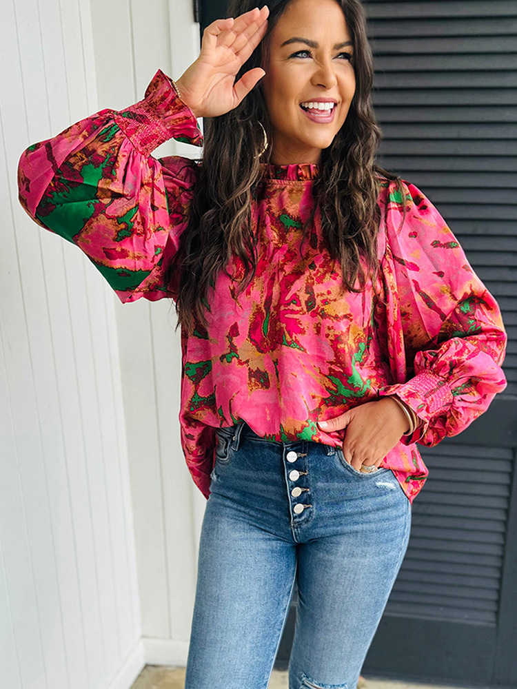 Color-block Printed Long-sleeve Top Womens Stand-collar Chiffon Blouse