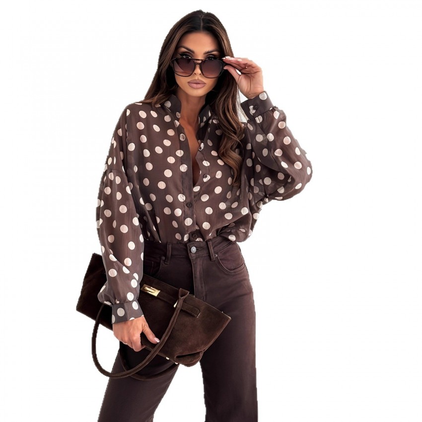 Womens Minimalist Long-Sleeve Polka-Dot Waist-Cinching Office-Ready Shirt